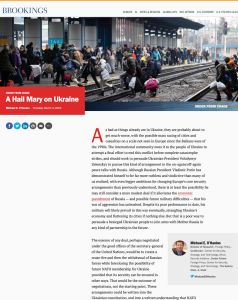 A ceasefire in Ukraine and a peace accord of some sort should be a priority for both East and West, lest Vladimir Putin’s irredentist ambitions spread, the global economy falters and Europe’s security is upended. But arriving at a resolution will be a complex process. In this incisive commentary, foreign policy expert Michael E. O’Hanlon offers some scenarios, based on historical precedents, that would need the cooperation of all parties at the negotiating table.