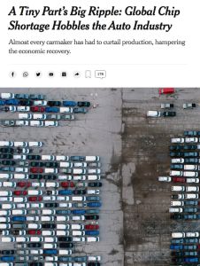 Auto assembly plants are slowing, and dealerships are empty because semiconductors are in short supply – semiconductors run cars’ entertainment systems, fuel injection and cruise control. They are necessary in electric cars and autonomous vehicles. Due to the shortage, one GM plant closed. Others are reserving limited chip supplies for high-end brands. As Jack Ewing and Neal E. Boudette report in The New York Times, the chip shortage occurred as the economy revived, and people became eager to buy cars, but semiconductor manufacturers focused on the lucrative consumer electronics market, including smartphones.