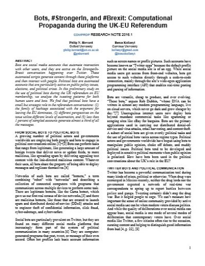 On June 23, 2016, voters in the United Kingdom changed the course of their history when they voted to leave the European Union. Pundits claim social media played a vital role in this unexpected outcome. In this analysis, researchers Philip N. Howard and Bence Kollanyi discuss the prevalence of “political bots” that produced Brexit-related content on Twitter between June 5 and June 12, 2016. They provide evidence for the rise in political bots on Twitter during periods of political strife. Their precursory study firmly sets the stage for what will surely become a growing field of research for years to come. getAbstract recommends this report to those interested in the intersection of big data, automation, social media and public policy.