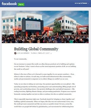 The challenges humanity faces today transcend country and cultural boundaries – terrorism, climate change and pandemics, to name a few. Such global issues require “global responses.” To that end, Facebook is developing better “social infrastructure” in five areas:
