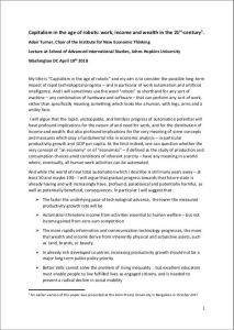 Technology and artificial intelligence are leading to rising levels of automated work. Although labor that is completely automated is still about 50 to 100 years in the future, the world is already beginning to feel the impact. One aspect of advancing automation and machine learning is their effect on the rate of productivity growth, which will decelerate as technology progresses. Total productivity could decline, even as it increases for individual processes, because workers displaced by automation will likely take up an increasing number of “low productivity jobs” as well as “higher...