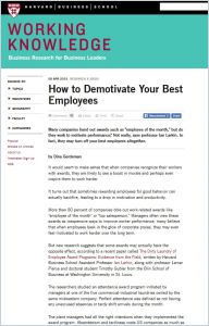 Recognition motivates employees, yet some company award programs have the opposite effect. A recent Harvard Business School study reveals that it matters a great deal how managers award employees, and for what. Freelance writer Dina Gerdeman talked with one of the study’s co-authors to find out how a well-intentioned incentive program ended up alienating a company’s most valuable employees. getAbstract recommends her article to managers who want to recognize their employees the right way.
