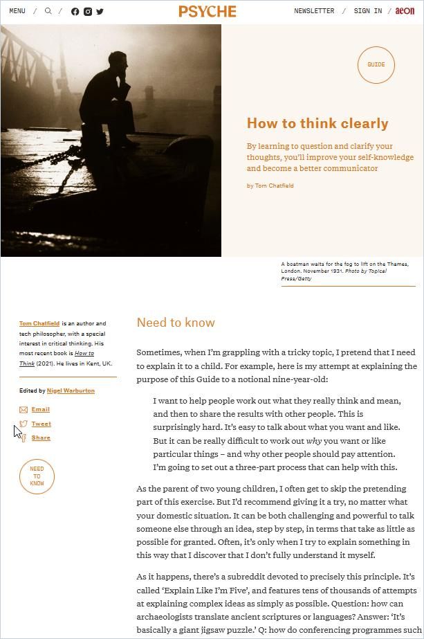 “Explain Like I’m Five,” a subreddit community on Reddit, challenges users to break complex topics down to the level that a child can understand. Technology philosopher Tom Chatfield posits that this is an excellent exercise for clarifying your thinking on any topic. His step-by-step approach to examining your thoughts can help you uncover why you think the way you do and expose the hidden assumptions that influence your reasoning. By understanding your own thoughts, you can communicate in a more meaningful way.