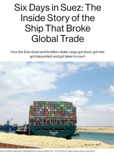 The Suez Canal shortens cargo transit between Europe and Asia by weeks, but it is hard to navigate. Massive ships carry thousands of containers down the relatively narrow, not-so-deep canal. An accident – like the giant ship Ever Given going aground and blocking the canal – causes an economic riptide. As Kit Chellel, Matthew Campbell and K. Oanh Ha report in Bloomberg Businessweek, this accident stalled billions in goods and paralyzed the just-in-time supply chain.