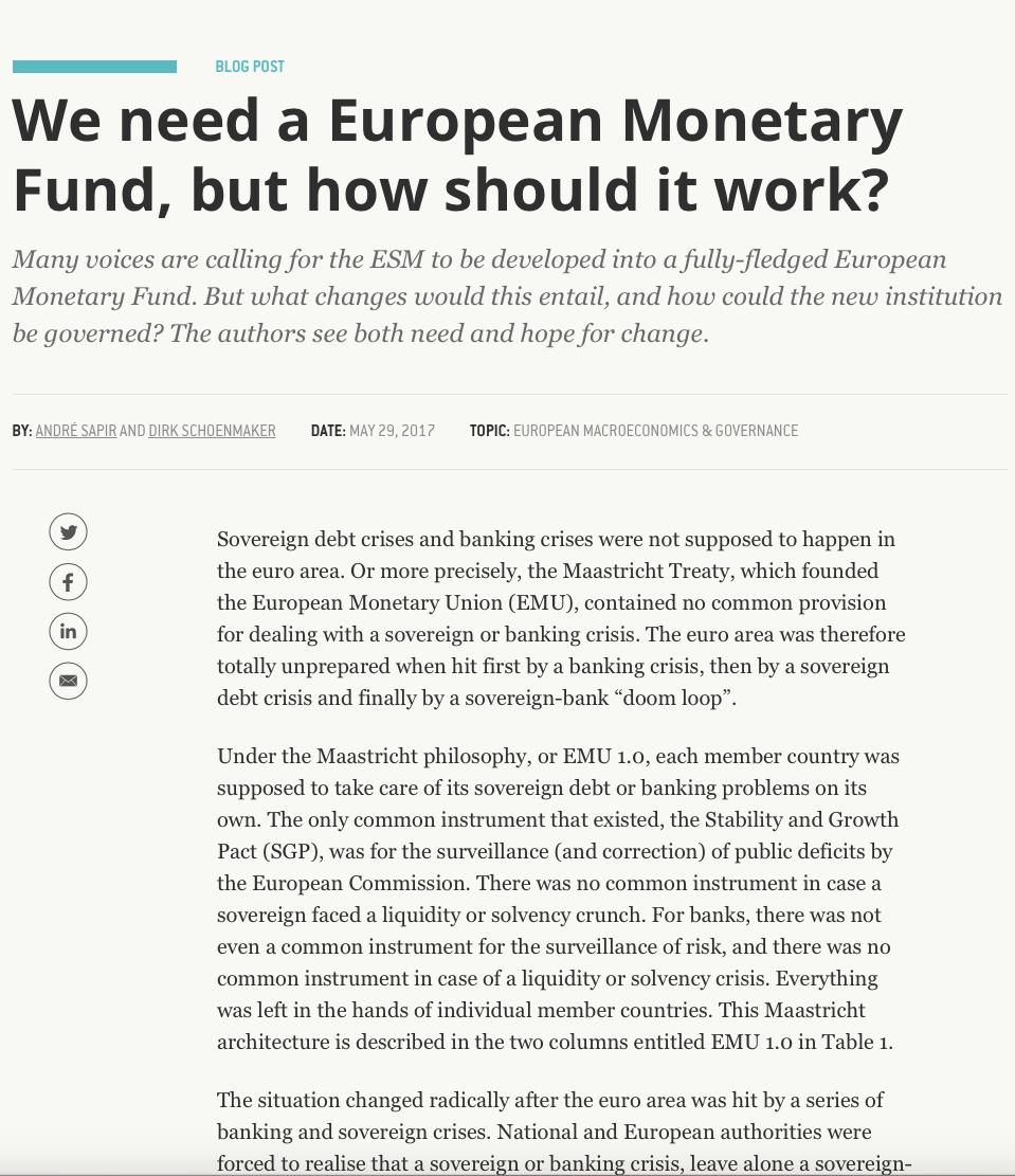 Over time, banking and sovereign debt crises have laid bare the original design flaws in the European Monetary Union (EMU), which sorely needed a blueprint to guide the region through financial tumult. According to this cogent essay by economists André Sapir and Dirk Schoenmaker, a transformation of the European Stability Mechanism – by expanding its responsibilities and reforming its governance – into a European Monetary Fund would help close gaps in the EMU edifice. getAbstract recommends this succinct but innovative text to policy analysts and experts.