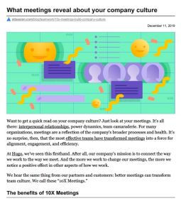 Working remotely doesn’t save you from excessive meetings. By Zoom or in a room, meetings often drain time and energy, with the loudest, most ambitious and most senior people present fighting for domination while everyone else mentally composes the three-line memo that could have replaced the meeting. How do you throw a meeting that is 10 times better – a “10x meeting” – than the usual? According to Darren Chait, meetings provide a microcosm of a company’s processes, dynamics and culture. He knows meetings – he’s the co-founder and COO of Hugo, a platform for sharing meeting notes. His guest post for Atlassian’s Work Life blog supplies actionable tips for achieving more effective meetings.