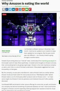 Amazon’s success is unassailable, tech entrepreneur and writer Zack Kanter is convinced. In this article, he explains why. Amazon turns internal processes into products. This makes the company money, but it benefits even more from the continual feedback it collects by being in the market. If services keep selling, all is well. If not, Amazon’s management knows the company needs to make them better or let them go. If there is a chink in Amazon’s armor, Kanter doesn’t find it. getAbstract recommends his insights to anyone with an interest in retail.