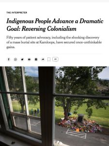En junio de 2021, los indígenas canadienses encontraron una fosa con los restos de 215 niños en los terrenos de una Escuela Residencial Indígena cerrada en Kamloops, Columbia Británica. El Informe de la Verdad y la Reconciliación de Canadá de 2015 relata que estas escuelas fueron fundamentales en la campaña de Canadá para acabar con la cultura indígena. Hace más de 50 años, como informa Max Fisher en The New York Times, los líderes indígenas lanzaron un esfuerzo global para abordar el impacto destructivo del colonialismo y restaurar la soberanía de los pueblos indígenas. El Día de la Verdad y la Reconciliación que se celebra anualmente en Canadá marca este esfuerzo incesante de memoria y misión. Como informa Fisher, la verdad y la reconciliación forman parte de un proceso complejo y continuo.