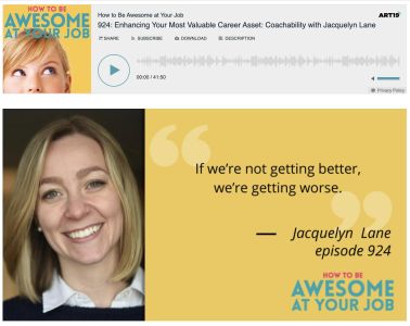 ¿Es usted un líder que busca tener un mayor crecimiento y desarrollo profesionales? En este episodio informativo de Cómo ser impresionante en su trabajo, el presentador Pete Mockaitis charla con la coach profesional Jacquelyn Lane sobre un factor vital en el desarrollo del liderazgo: la “entrenabilidad”. Descubra los poderosos beneficios de ser un líder que adopta los cuatro componentes críticos de la entrenabilidad. Lane explica por qué la apertura al cambio, aprender a aceptar la retroalimentación, tomar acción y mantener el impulso para evolucionar tienen efectos duraderos en su trayectoria profesional y en aquellos a los que dirige.