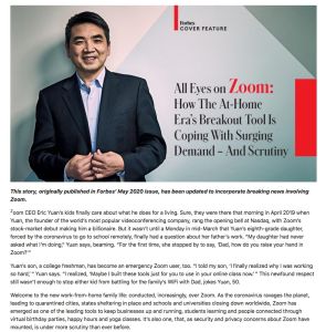 A pandemia do COVID-19 fechou empresas e escolas e colocou pessoas em quarentena em suas casas mundo afora, promovendo um aumento no trabalho remoto. Como resultado, a empresa de videoconferência Zoom ganhou destaque rapidamente ao permitir que empresas funcionem, estudantes participem de aulas, igrejas compartilhem seus cultos e amigos se conectem. Escrevendo para a Forbes, Alex Konrad adverte que a missão original do Zoom não incluía tanta atenção ou uma grande variedade de usos, sendo então inevitável o surgimento de problemas. Konrad oferece a sua visão sobre um serviço do qual muitos dependem atualmente para lidar com as demandas do distanciamento social e dos empregos virtuais.